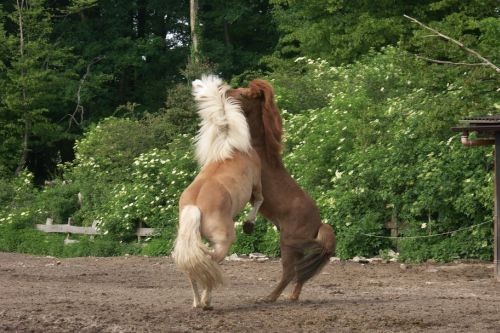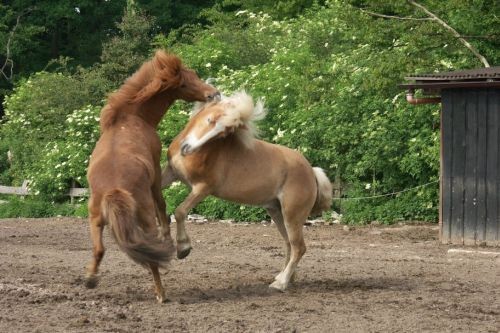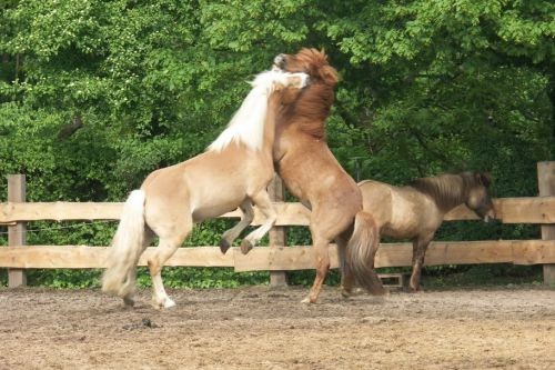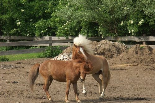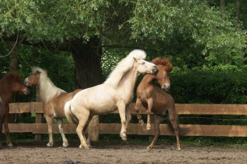 Chestnut colour in all shades from light to dark with light coloured manes and tails.